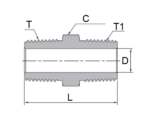 Sechskantnippel zum Anschließen von zwei Gewinderohren oder -beschlägen und der Ausdehnung der Rohrlänge, sechseckiger mittlerer Abschnitt zum Anziehen mit einem Schraubenschlüssel.